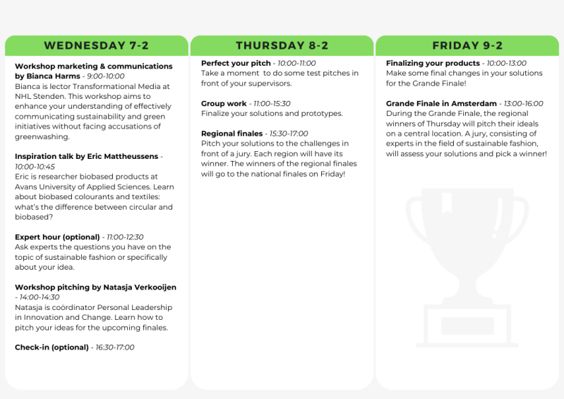 On February 9th, the Grande Finale takes place at Fashion for Good in Amsterdam. During the finale, each regions' best team(s) pitch their ideas to an expert jury, who will pick the winner of the National Hackathon Circular Economy 2024.